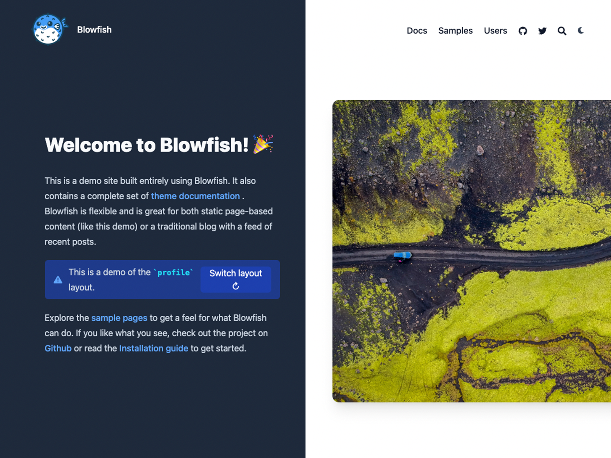 The hero layout brings together ideas from the profile and card layouts. This one not only displays information on the author of the site but it also loads your markdown beneath it.