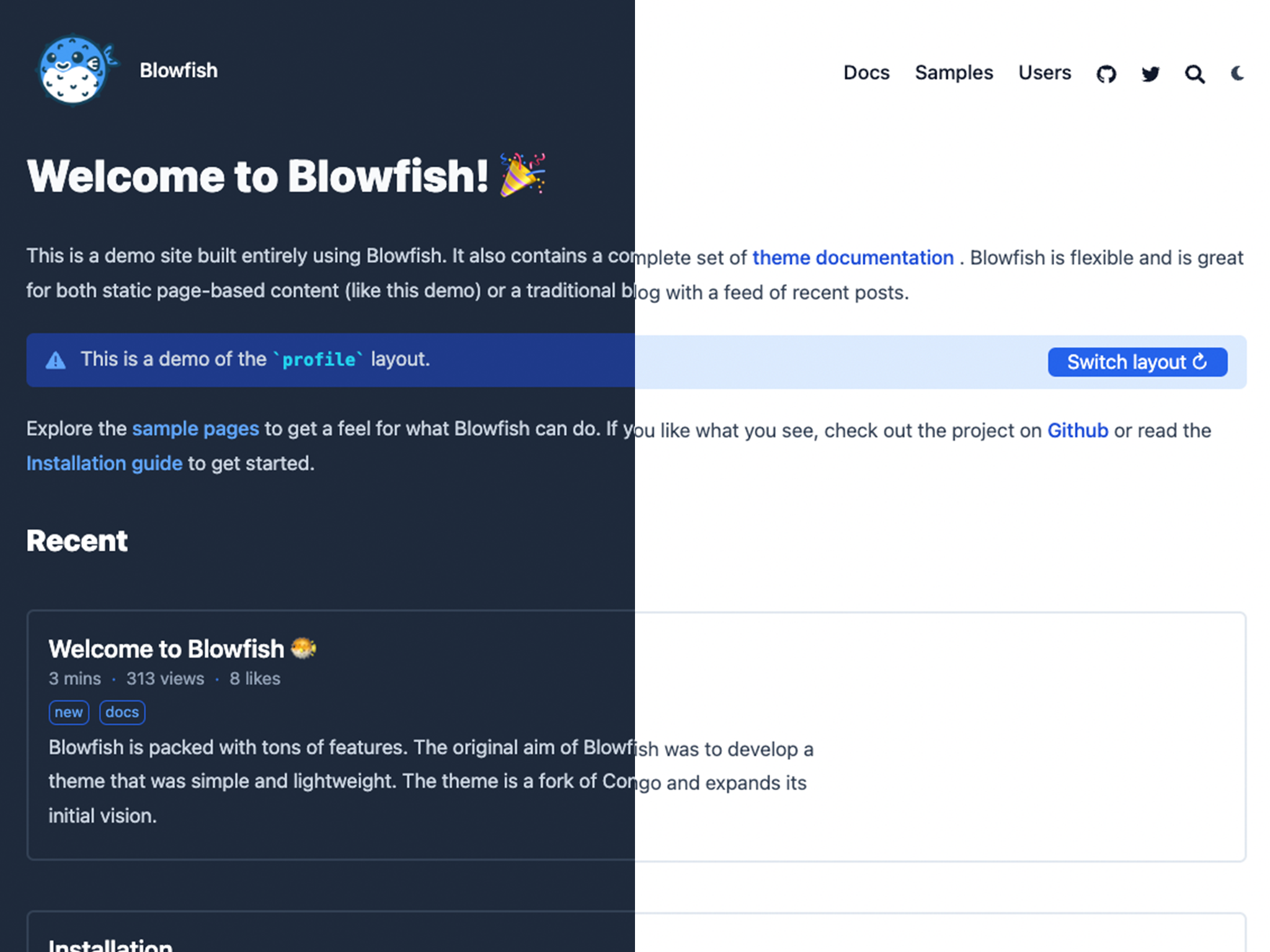 As an example, the homepage on this site uses the custom layout to allow toggling between the profile and page layouts. Visit the GitHub repo to see how it works.